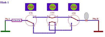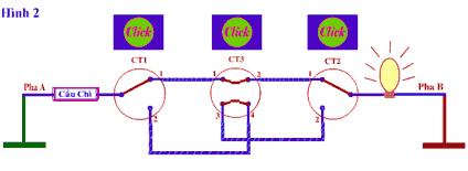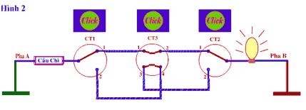 + Ở hình 2 CT1 đang ở vị trí 1, CT2 đang ở vị trí 1 và CT3 đang ở vị trí 1-2 và 3-4, lúc này mạch điện thông nên đèn sáng