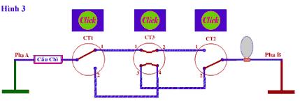 + Ở hình 3 CT1 đang ở vị trí 1, CT2 đang ở vị trí 2 và CT3 đang ở vị trí 1-2 và 3-4, lúc này mạch điện hở nên đèn tối