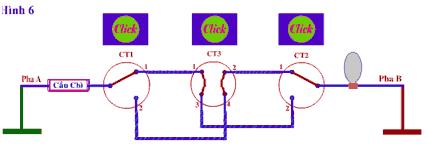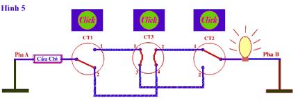+ Ở hình 5 CT1 đang ở vị trí 2, CT2 đang ở vị trí 1 và CT3 đang ở vị trí 1-3 và 2-4, lúc này mạch điện thông nên đèn sáng