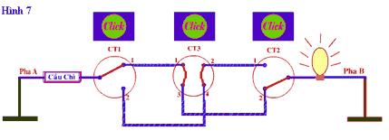 + Ở hình 7 CT1 đang ở vị trí 1, CT2 đang ở vị trí 2 và CT3 đang ở vị trí 1-3 và 2-4, lúc này mạch điện thông nên đèn sáng